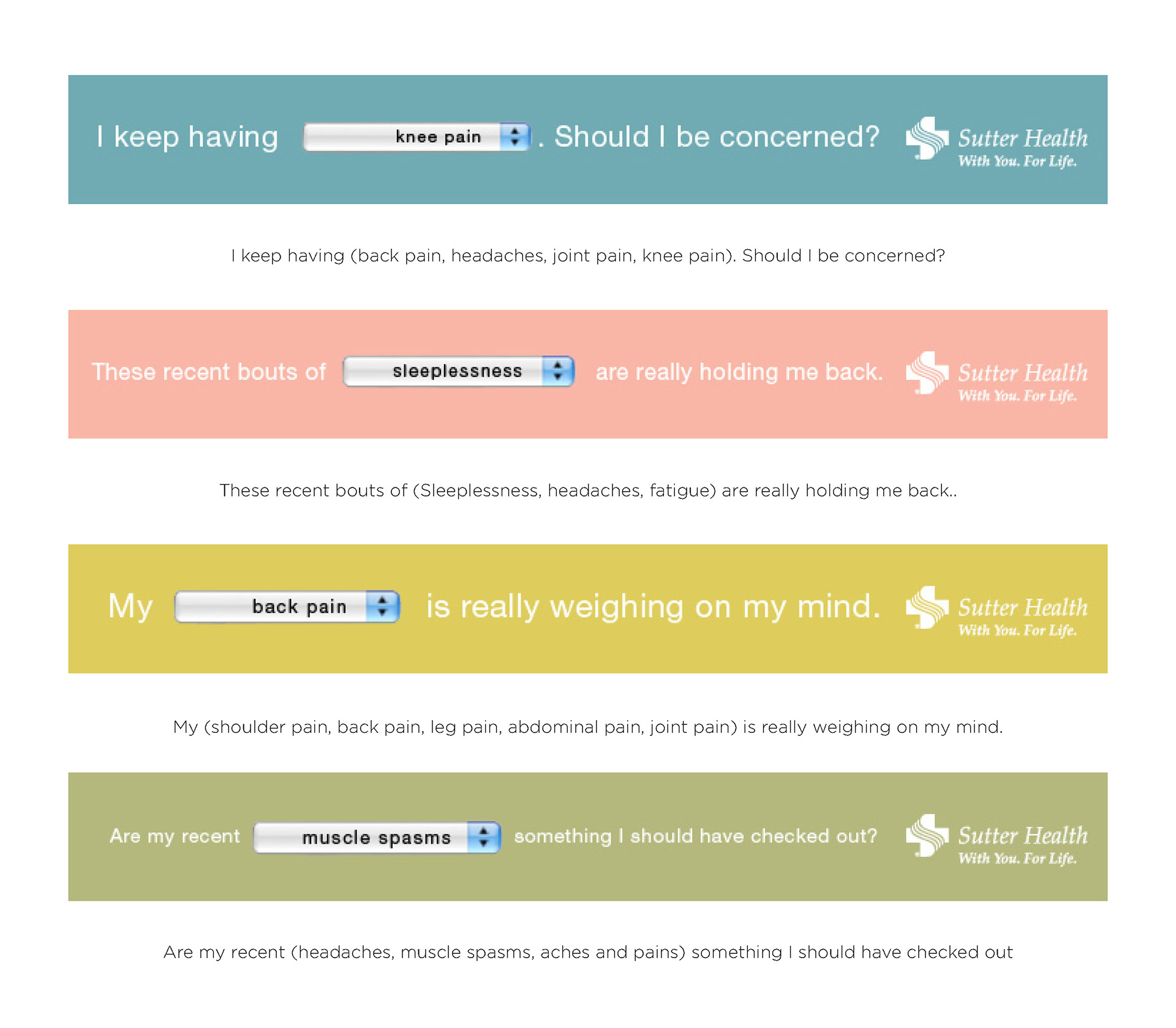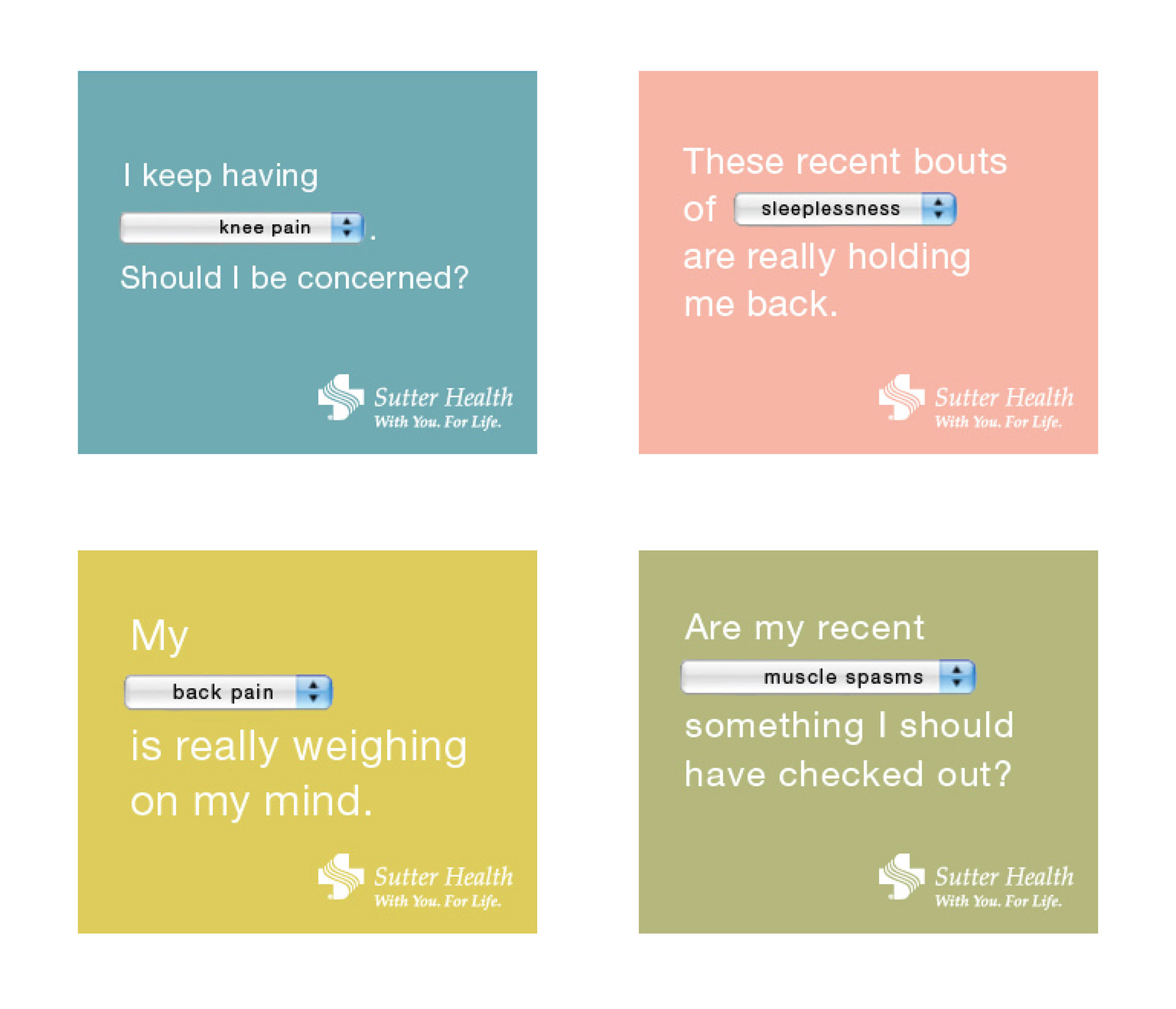 In a funny coming-of-the-times way, we leveraged the humble pulldown menu to say we understand technology and your health at the same time. These banners for Sutter Health may have been a little too in the future for them, but idea and execution were solid.